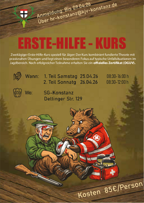 Samstag, 25. April 2026 von 08:30 - 16:00 Uhr; Zweiter Tag: Sonntag, 26.04.2026 von 08:30 - 12:00 Uhr Erste-Hilfe-Kurs für Jäger mit starkem Paxisbezug und anerkanntem Teilnahmezertifikat; Dauer 2 Tage; Kosten €85,-